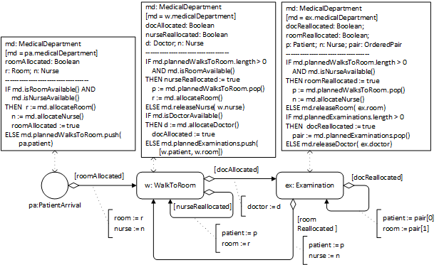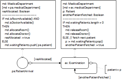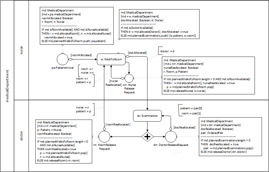 This process design model defines three event rules. Notice that the Examination event rule either re-allocates the doctor to the next planned examination and schedules it, if there is one, or it releases the doctor and re-allocates the room to the next planned walk-to-room and schedules it, if there is one.
