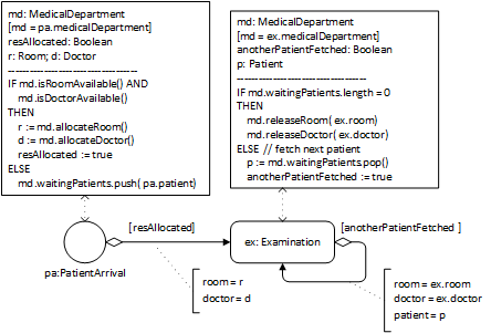 Notice that the event scheduling arrows of Figure 3-12, and also the SCHEDULE statements of the corresponding event rule tables, do not contain assignments of the duration of activities, since it is assumed that, by default, whenever an activity type has an operation duration(), the duration of activities of this type are assigned by invoking this operation.