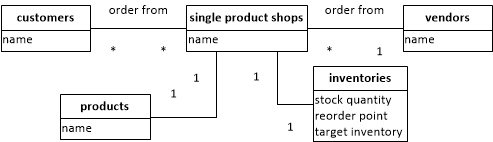 We can extract the following candidates for object types from the problem description by identifying and analyzing the domain-specific noun phrases: shops (for being more precise, we also say single product shops), products (or items), inventories, customers, customer orders, replenishment orders, and vendors. Since noun phrases may also denote events (or event types), we need to take another look at our list and drop those noun phrases. We recognize that customer orders and replenishment orders denote messages or communication events, and not ordinary objects. This leaves us with the five object types described in the diagram shown in Figure 2.1.